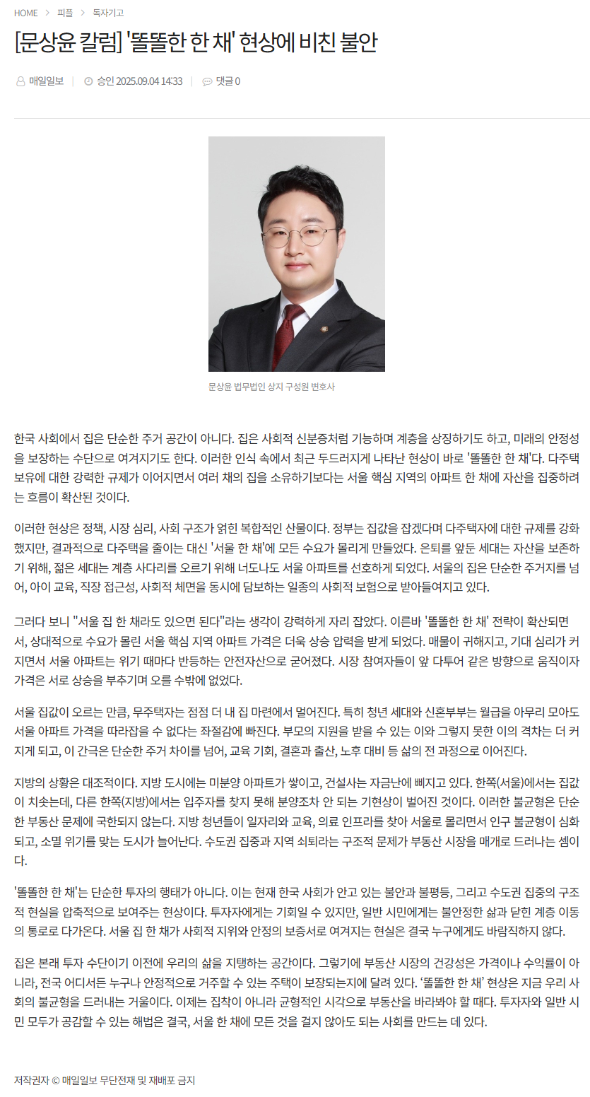 집은 본래 투자 수단이기 이전에 우리의 삶을 지탱하는 공간이다. 그렇기에 부동산 시장의 건강성은 가격이나 수익률이 아니라, 전국 어디서든 누구나 안정적으로 거주할 수 있는 주택이 보장되는지에 달려 있다. ‘똘똘한 한 채’ 현상은 지금 우리 사회의 불균형을 드러내는 거울이다. 이제는 집착이 아니라 균형적인 시각으로 부동산을 바라봐야 할 때다. 투자자와 일반 시민 모두가 공감할 수 있는 해법은 결국, 서울 한 채에 모든 것을 걸지 않아도 되는 사회를 만드는 데 있다.
