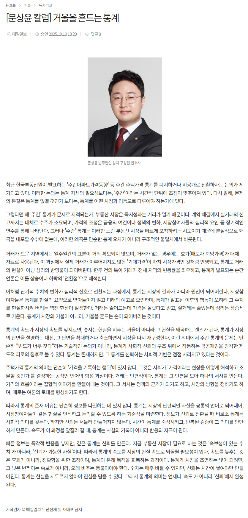 통계의 속도가 시장의 속도를 앞지르면, 숫자는 현실을 비추는 거울이 아니라 그 현실을 왜곡하는 렌즈가 된다. 통계가 시장의 단면을 설명하는 대신, 그 단면을 확대하거나 축소하면서 시장을 다시 재구성한다. 이런 의미에서 주간 통계의 문제는 단순히 "빈도가 너무 잦다"라는 기술적인 논의가 아니라, 통계가 사회적 신뢰의 구조 위에서 작동하는 공공재임을 망각한 제도적 피로의 징후로 볼 수 있다. 통계는 존재하지만, 그 통계를 신뢰하는 사회적 기반은 점점 사라지고 있다는 것이다.
