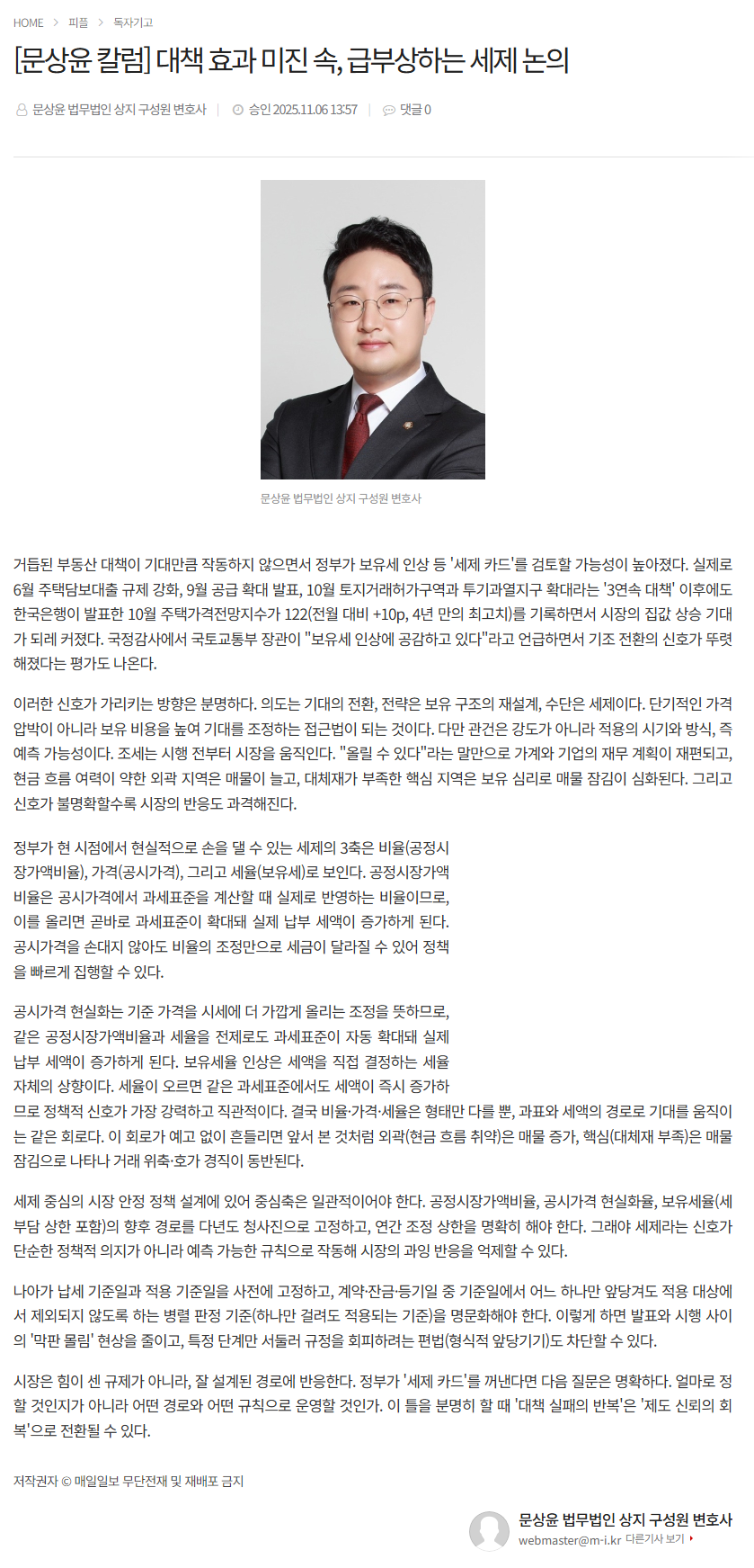 시장은 힘이 센 규제가 아니라, 잘 설계된 경로에 반응한다. 정부가 '세제 카드'를 꺼낸다면 다음 질문은 명확하다. 얼마로 정할 것인지가 아니라 어떤 경로와 어떤 규칙으로 운영할 것인가. 이 틀을 분명히 할 때 '대책 실패의 반복'은 '제도 신뢰의 회복'으로 전환될 수 있다.