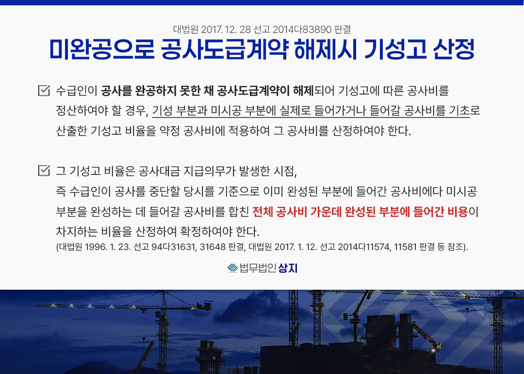 시공사(피고)는 건축물을 거의 다 시공하였다고 주장하면서, 이에 따라 93%가 넘는 기성금을 수령하였으나,