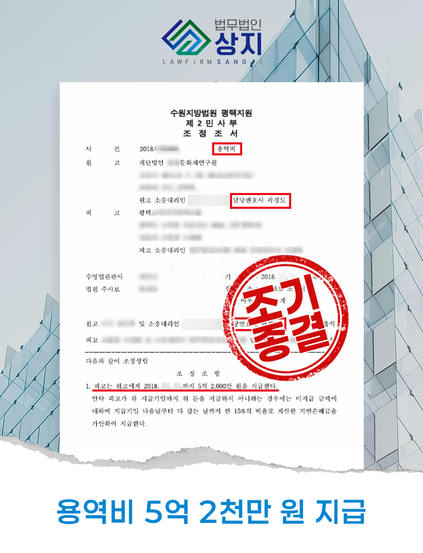 법원 감정이 필요한 경우 분쟁이 장기화될 우려가 있었으나, 조정으로서 조기종결되어 의뢰인께서도 만족하신 사건입니다.