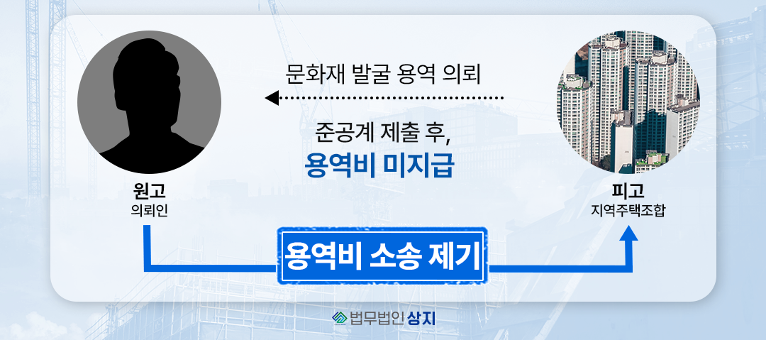 경기도 평택시 모지역의 지역주택조합을 통한 주택건설을 위한 신축공사 도중 문화재가 발견되었고, 원고(의뢰인)측에 문화재 발굴 용역 사업을 의뢰하여 준공을 완료하였으나,