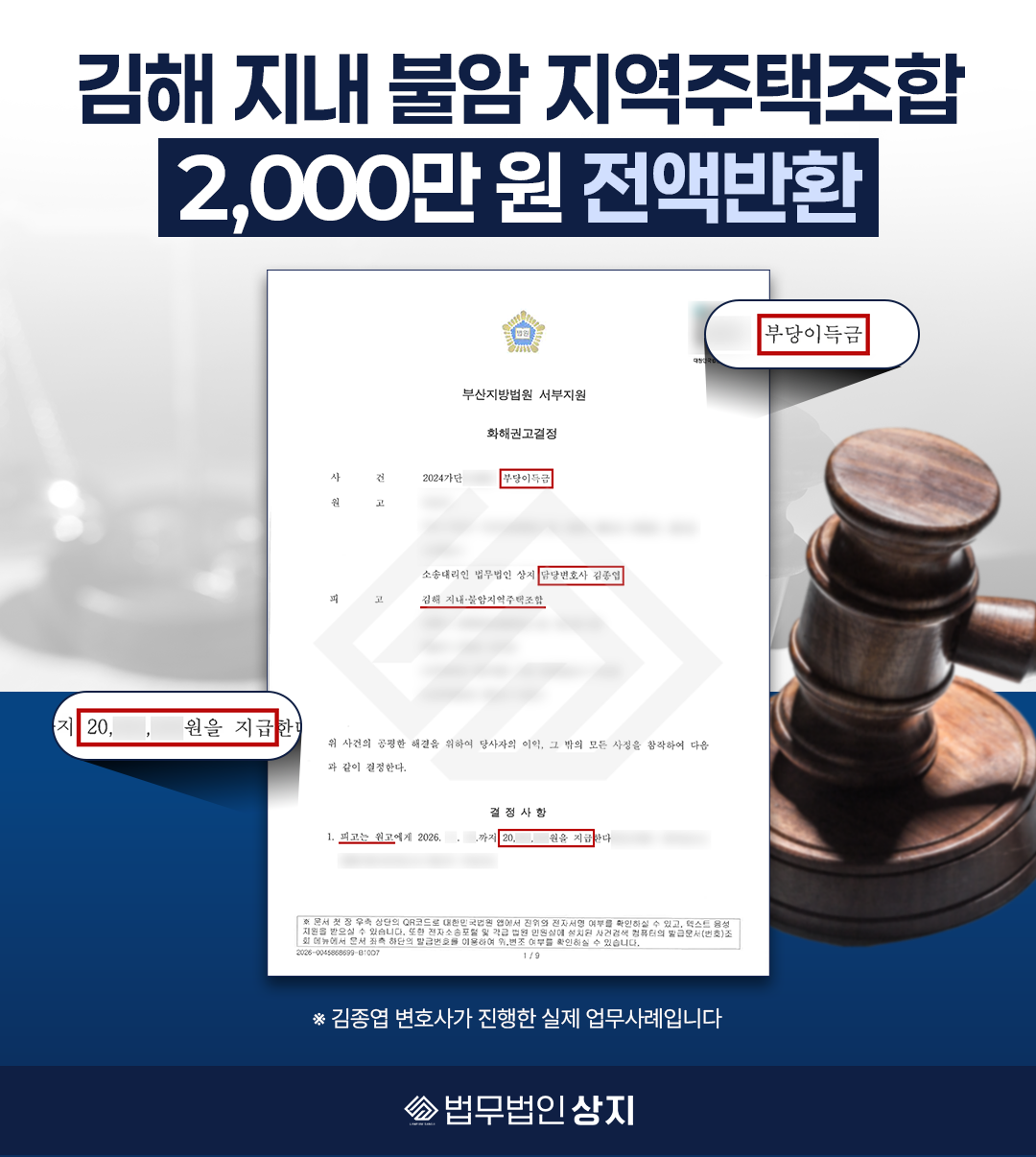 그 결과 조합이 의뢰인에게 부당이득금 2천만 원을 지급하는 내용으로 사건이 종결되었습니다.